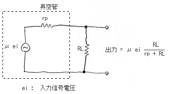 この式の理由は、下の図を見ると分かる。真空管の入力にeiという電圧の信号が入力されると、増幅率μで増幅されてμ eiになる。これが、図のようにrpとRLで分圧されて、RL側に出力として出てくる、と考えるのである。この理屈および数式から、RLが小さくなるとゲインがどんどん落ちることが分かるだろう。これが、負荷抵抗のところで説明した、負荷抵抗を内部抵抗の2倍以上ぐらいに取る、という根拠である。