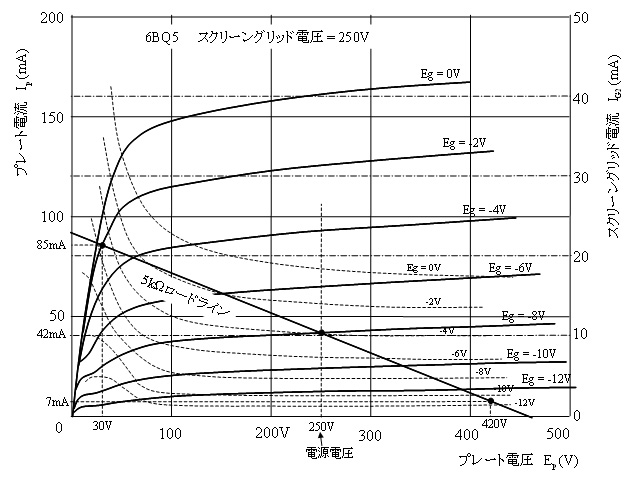 PD = 250(V) × 42×10-3(A) = 10.5W …(1式)規格表によると6BQ5の最大プレート損失は12Wなので、これを下回っており、この動作点はOKである。