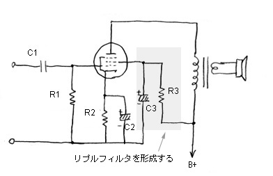 そこで、この観点から言うと、下の図のようにスクリーングリッド電圧をR3で落とす回路の方がずっと有利である。以前の原理編の5極管電力増幅回路や5極管の電圧増幅回路設計のときと同じである。この場合、図のグレー部分がリップル除去の平滑回路を構成するので、C3に少し大きい電解コンデンサを使えばスクリーングリッドに入るリップルは激減する。このように、スクリーングリッドのバイパスコンデンサは、信号成分のバイパスの働きと同時に、電源電圧のリップル除去の役目も担っているのである。