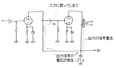 ここで下の左の図のように、Rを入れずに、Cだけで2段分の電源を供給してみよう。そうすると、2段目のプレートに流れる信号電流はCを通ってグランドへ抜けるが、そのときCの両端に信号電圧を発生させる。よくみるとこのCの両端の信号電圧はそのまま1段目の出力に加わっていることが分かる。つまり、出力が入力に戻ってしまう現象が発生するのである。出力が入力に戻ってしまうと発振の恐れもあるし、動作が不安定になる。このCが巨大でインピーダンスがほとんどゼロとみなせれば大丈夫な道理なのだが、インピーダンスは低域ほど高くなり、無視できなくなる。結局、低域で発振などの困った現象が起こることになる。