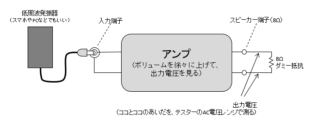 測定というのは実際は厳密にやるにはけっこう難しいものなのだが、ここでは簡易的な方法だけを紹介する。アンプの測定に最低限必要な機材は、低周波発振器と、テスターと、ダミー抵抗(ダミーロードともいう)である。
