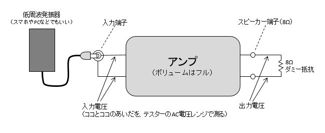 たとえば10V出ていたら、12.5Wということになる。うるさくても平気、という人だったらダミー抵抗ではなくスピーカーをつないだ状態で測ってもいい。