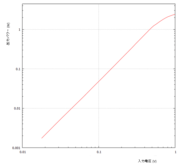両対数に入力電圧と出力パワーをプロットすると、歪まずに増幅している領域では、数学的に言って傾き2の直線になる(ちょっと急な直線)。で、歪み出すと直線でなくなり、クリップする様子がそのまま直読できる。図を見ると、1.3Wぐらいまではきれいに直線で、そこらへんから応答がやや下がって来る。ただ、急に下がることは無く、だらだらと2.3Wぐらいまで上がり続ける。ちなみに、下のグラフが急じゃなくて45度の直線になっているのは、縦軸と横軸のスケールがよく見ると1:2になっているからである。