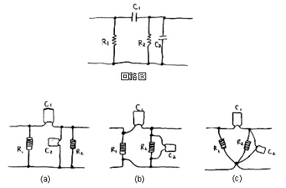 まずは、ものすごく基本的なことだが、回路図と配線の関係の話である。今、右図のような回路があったとする。これを配線するとき、この回路図と同じ形に配線しなくてはいけないわけではない。図の(a)から(c)までのようにいろいろな配線の仕方があり、これらはすべて電気的には同じである。というのは、配線に使う銅線は理想的には抵抗がゼロなので、どう引き回しても同じというわけだ。